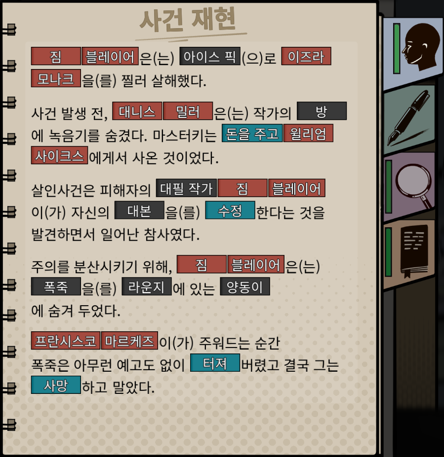| 등장인물 | 녹음 | 사건 재현 |